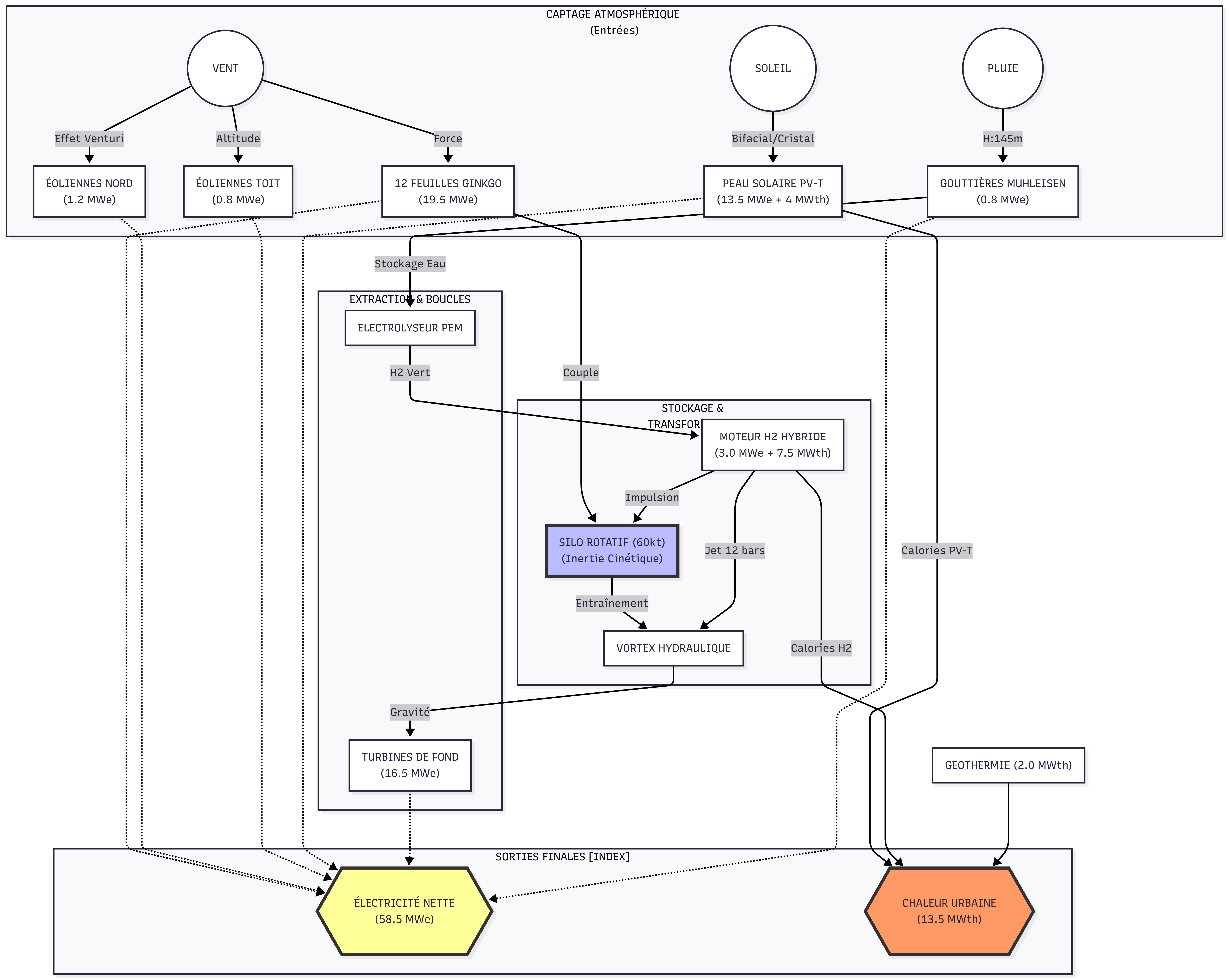 ## 🔄 2. LE PARCOURS DES FLUX (La Symbiose)## Flux Éolien & Cinétique :