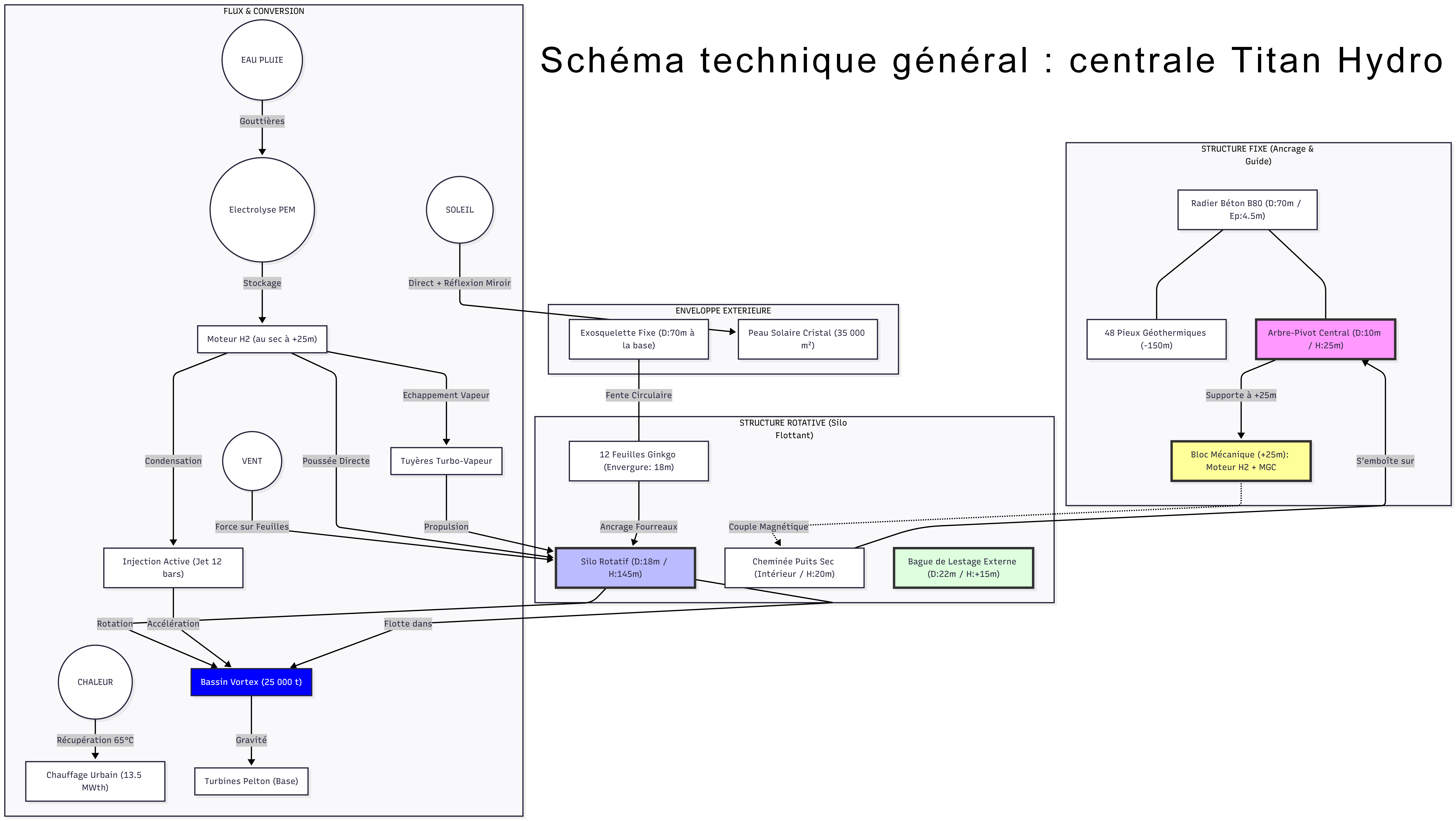 Voici l'architecture textuelle détaillée de la TITAN-SIMPLE HYDRO (Standard 2026). Ce schéma décompose la tour en strates structurelles et suit le parcours des flux énergétiques de la capture jusqu'au profit.