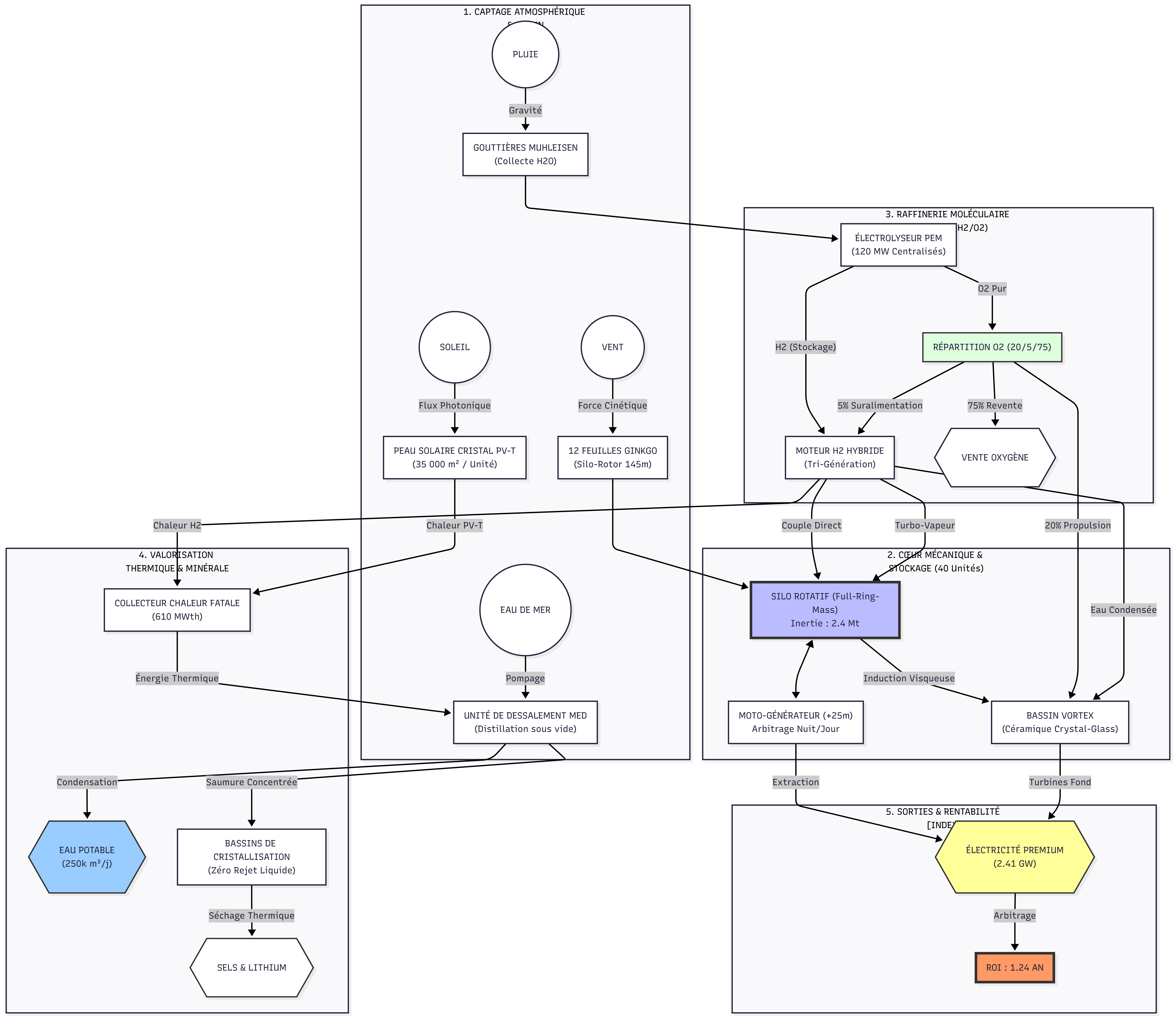 La centrale est un filtre intelligent : elle prend de l'eau de mer brute et du vent, et elle en sort quatre produits de haute valeur (Élec, Eau, Gaz, Sel). Rien ne sort sous forme de déchet. C'est cette intégration totale qui verrouille ton ROI de 1,24 an.