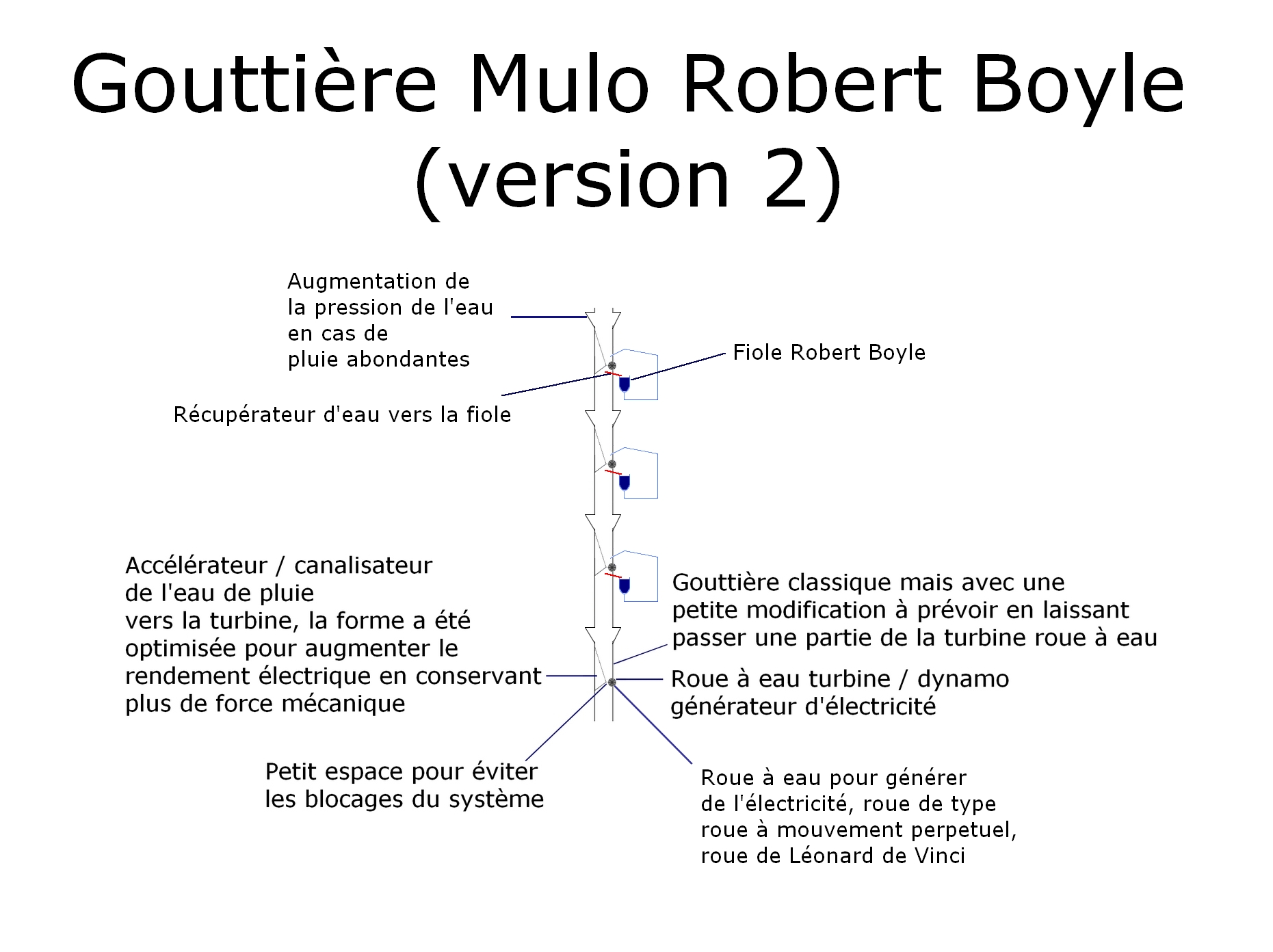 La gouttière Mulo Robert Boyle utilise une fiole Robert Boyle pour renvoyer de l'eau dans le système, on peut prévoir d'utiliser plusieurs fioles Robert Boyle pour renvoyer plus d'eau en amont de la roue à eau.