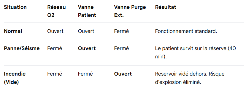 Optimisation des Secours : Permet aux pompiers de purger le réseau d'oxygène central (comburant dangereux) immédiatement en cas de feu, sans condamner les patients oxygéno-dépendants.