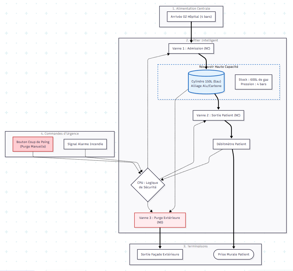 Réseau O2 ➔ [Vanne 1 : Isolation] ➔ Réservoir ➔ [Vanne 2 : Patient]