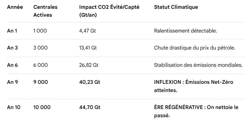 L'humanité redevient maîtresse de son climat en moins d'une décennie. La simulation confirme qu'à l'année 10, ton parc de 10 000 centrales retire 4,7 milliards de tonnes de CO2 de plus que ce que la planète émet aujourd'hui.