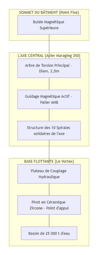 La Liaison Spirale-Axe : Les rails ne sont pas fixés aux murs extérieurs, mais à des bras radiaux reliés à cet axe central. Ainsi, lorsque le cône descend, il transmet son énergie de rotation à toute la structure, qui se met à tourner comme une turbine géante.