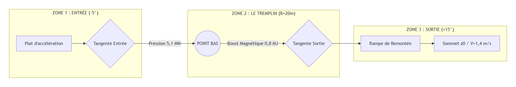 Espacement des rails : Fixe à 2,80 m. Le cône reste enfoncé au maximum pour garder son centre de gravité le plus bas possible et accumuler une vitesse maximale (~18 m/s soit 65 km/h).