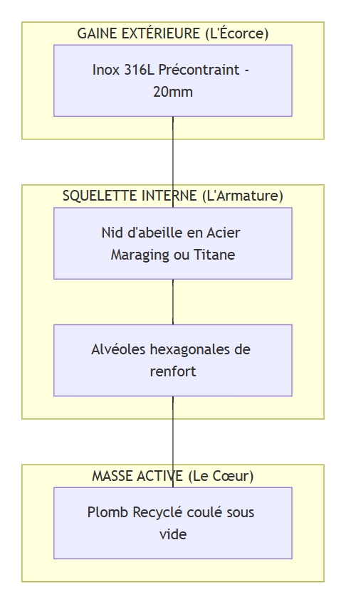 L'Armature : À l'intérieur du plomb, on coule une structure en nid d'abeille en titane ou en acier Maraging. Ce squelette rigide absorbe les contraintes mécaniques.
